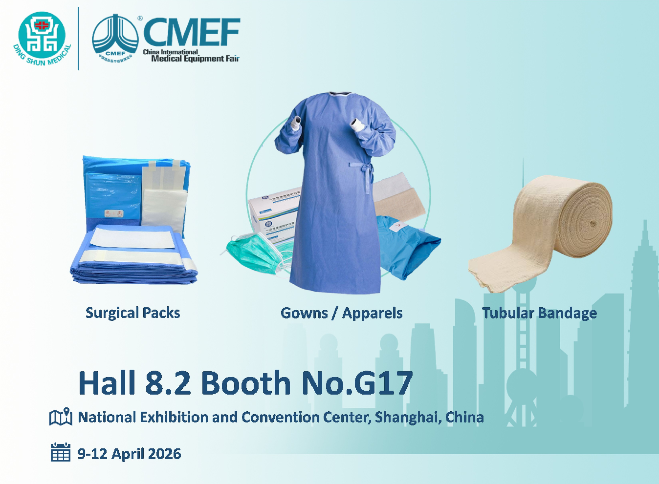 Het bedrijf zal zijn producten presenteren Chirurgische pakketten , Jurken/kleding , en Buisvormig verband productlijnen in hal 8.2, stand nr. G17. Het evenement vindt plaats in het National Exhibition and Convention Centre in Shanghai.